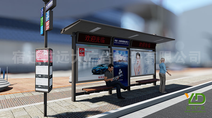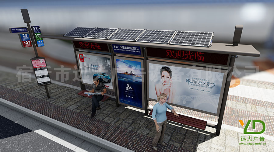 該款候車亭充分利用了太陽能這一清潔能源,總配1000W太陽能電池板,可維持大型廣告燈箱、LED顯示屏、BUS燈箱、站牌燈箱用電。